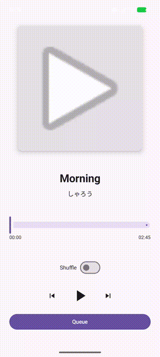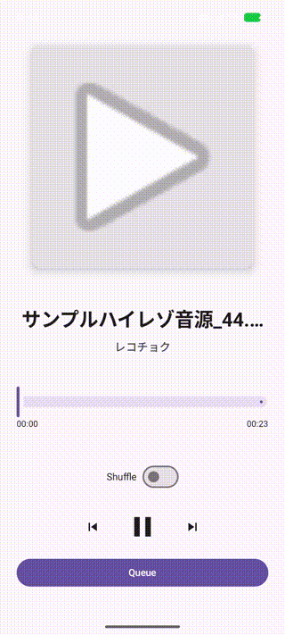 Google公式の推奨アーキテクチャ(MAD)と、Media3ライブラリを使用し、バックグラウンド再生や再生キューの操作(並び替え・削除)に対応する。