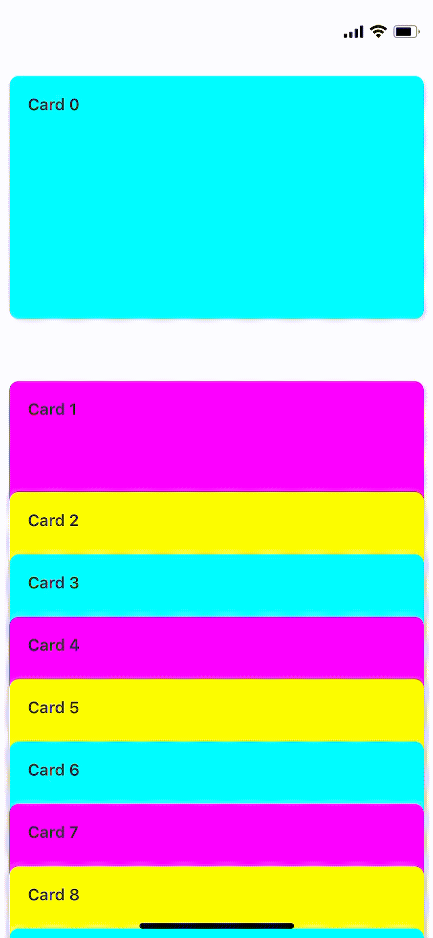 「animatedValue.interpolate()」関数を用いてスクロール時のスタイルの挙動アニメーションを定義します。「inputRange」がリスト内でのカードの位置を表しており「outputRange」がそれに対応するカードのスタイルを表します。 ちなみに「outputRange」を全て「0」にすると以下のようになります。(itemHeight = 54のため高さ54のリストとして描画される)